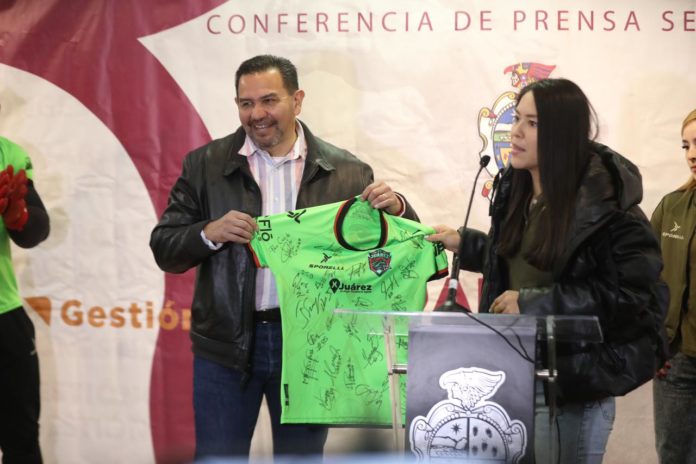 En agradecimiento al apoyo que han recibido de la administración municipal, jugadoras del equipo de futbol Bravas del FC Juárez obsequiaron hoy al Presidente Cruz Pérez Cuéllar una camiseta con los autógrafos de las integrantes del grupo.