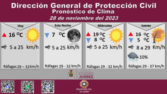 Roberto Briones Mota, titular de la dependencia, informó que para hoy se esperan ráfagas de viento que alcanzarán los 32 kilómetros por hora, en tanto que la velocidad del viento durante el día oscilará entre 5 y 25 kilómetros por hora.
