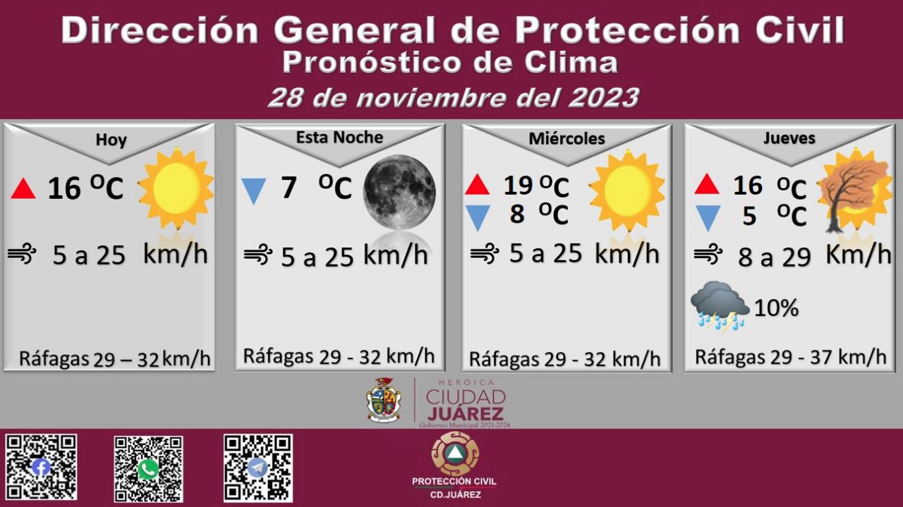 Para mañana miércoles se esperan vientos que llegarán a los 32 kilómetros por hora, la temperatura máxima se pronostica en los 19 °C, mientras que la mínima será de 8 °C, la velocidad del viento oscilará de 5 a 25 kilómetros por hora.