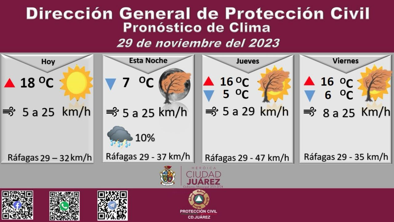 Para mañana jueves se esperan fuertes ráfagas de viento que llegarán los 47 kilómetros por hora, la temperatura máxima se pronostica en los 16 °C, mientras que la mínima será de 5 °C, la velocidad del viento oscilará de 5 a 29 kilómetros por hora.