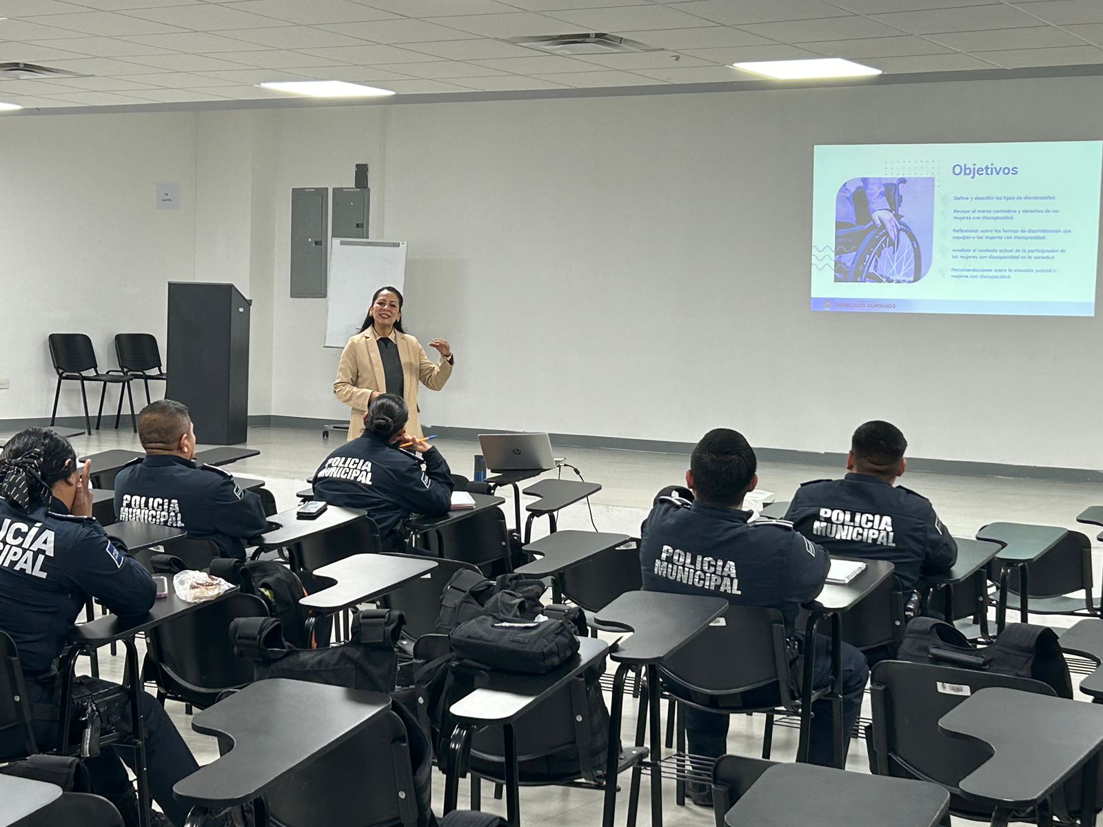 Como parte del compromiso de fortalecer la capacitación y sensibilidad de las fuerzas policiales, la Secretaría de Seguridad Pública Municipal (SSPM) y la Agencia Estatal de Investigaciones (AEI) participaron en el taller “Primeros respondientes en la atención a mujeres con discapacidad y mujeres migrantes”, informó Santiago González Reyes, director de Derechos Humanos del Gobierno Municipal.