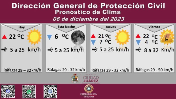 Roberto Briones Mota, titular de la dependencia, informó que para hoy se esperan fuertes ráfagas de viento que alcanzarán los 32 kilómetros por hora, en tanto que la velocidad del viento durante el día oscilará entre 5 y 25 kilómetros por hora.