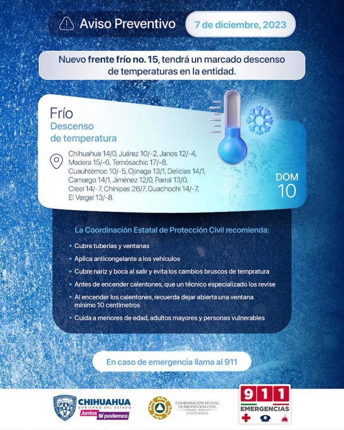 La dependencia dio a conocer que las temperaturas para algunas de las comunidades y municipios de la entidad en los próximos días, serán: Chihuahua 14/0, Juárez 10/-2, Janos 12/-4, Madera 15/-6, Temósachic 17/-8, Cuauhtémoc 10/-5, Ojinaga 13/1, Delicias 14/1, Camargo 14/1, Jiménez 12/0, Parral 13/0, Creel 14/-7, Chínipas 26/7, Guachochi 14/-7, El Vergel 13/-8.