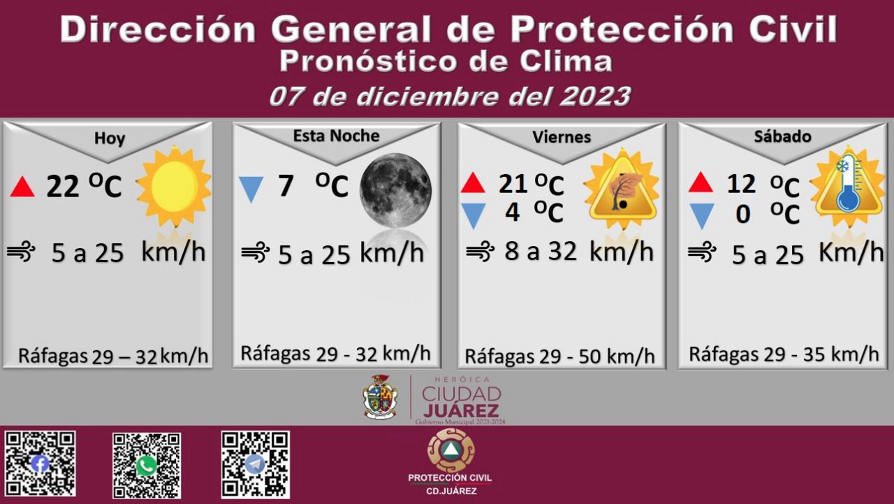 Para mañana viernes se esperan fuertes ráfagas de viento que llegarán a los 50 kilómetros por hora, la temperatura máxima se pronostica en los 21 °C, mientras que la mínima será de 4 °C, la velocidad del viento oscilará de 8 a 32 kilómetros por hora.