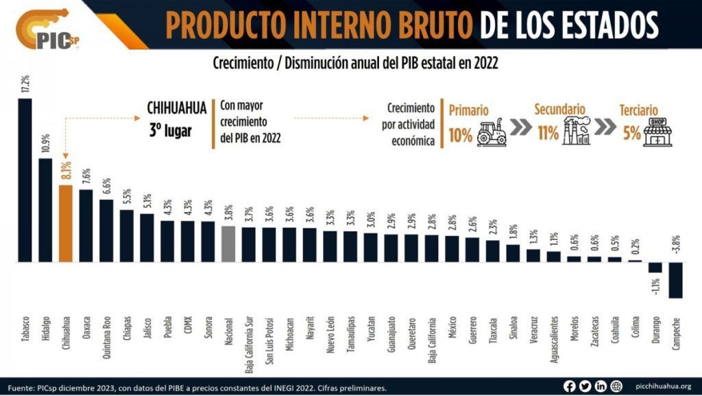 El estado de Chihuahua ocupó el tercer lugar entre las entidades federativas con mayor crecimiento de su Producto Interno Bruto (PIB) durante 2022, con 8.1 por ciento, lo que representa un avance de 12 lugares con respecto al 2021, año en el que se ubicó en la quinceava posición.