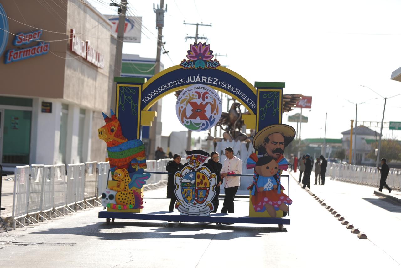 Mientras inicia el desfile, los juarenses disfrutan de la música, además reciben banderolas conmemorativas con la leyenda “Todos somos Juárez y todos somos felices”.