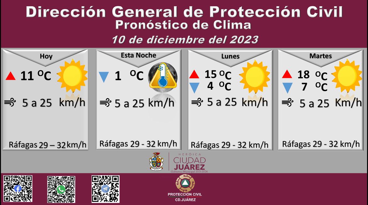 Roberto Briones Mota, titular de la dependencia, informó que para hoy se esperan fuertes ráfagas de viento que alcanzarán los 32 kilómetros por hora, en tanto que la velocidad del viento durante el día oscilará entre 5 y 25 kilómetros por hora.