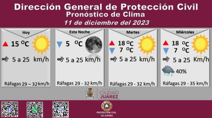 Roberto Briones Mota, titular de la dependencia, informó que para hoy se esperan fuertes ráfagas de viento que alcanzarán los 32 kilómetros por hora, en tanto que la velocidad del viento durante el día oscilará entre 5 y 25 kilómetros por hora.