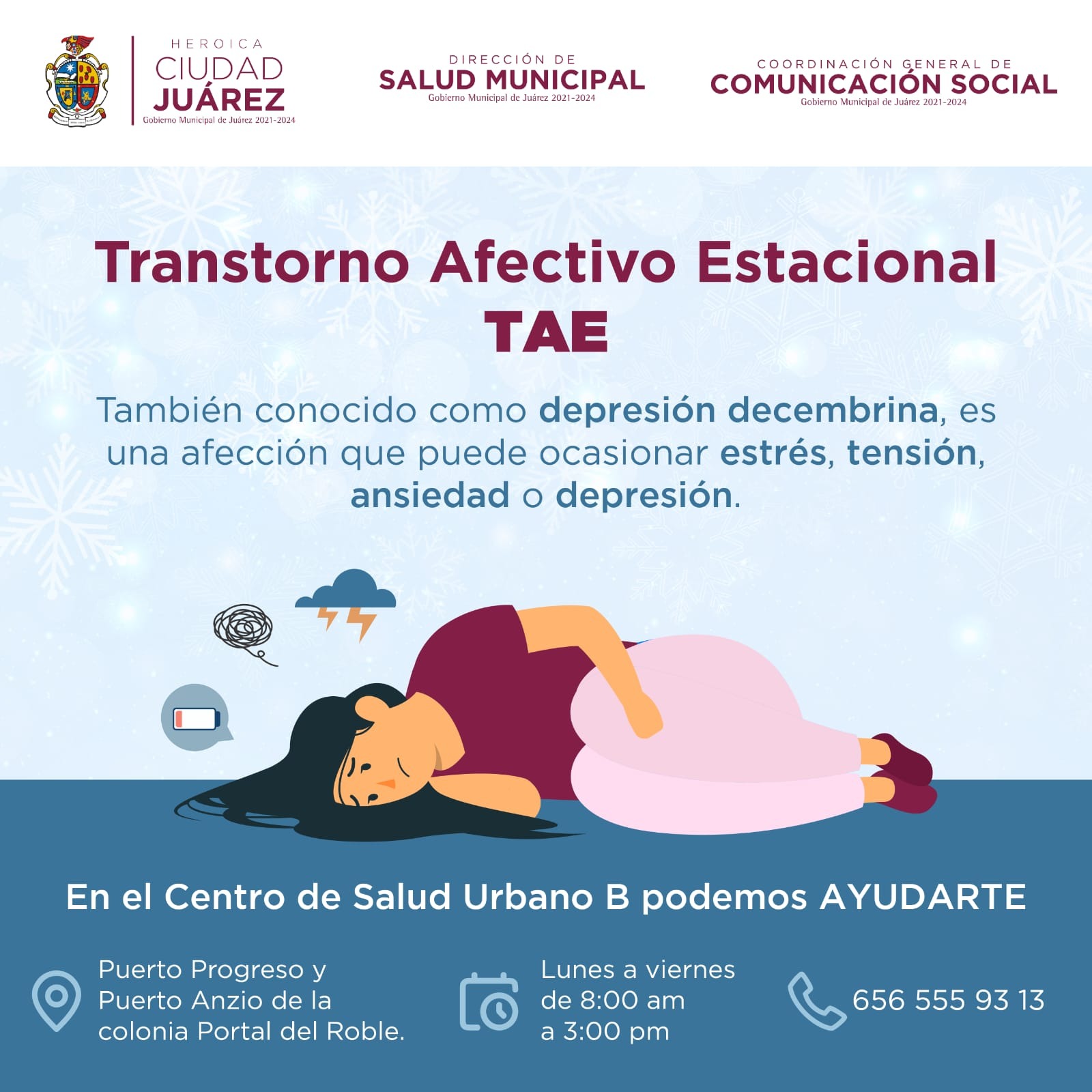 La Dirección de Salud Municipal a través del Centro de Salud Urbano B, da terapia gratuita para los juarenses que sufren el trastorno Afectivo Estacional (TAE), también conocido como depresión decembrina, la cual puede ocasionar estrés, tensión, ansiedad o depresión.