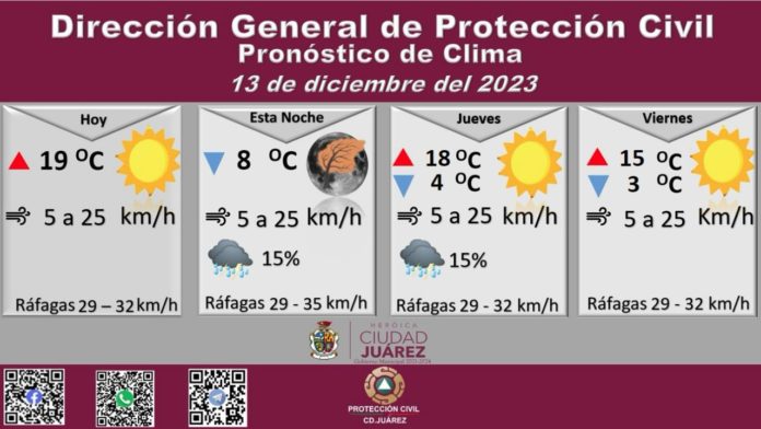 Roberto Briones Mota, titular de la dependencia, informó que para hoy se esperan fuertes ráfagas de viento que alcanzarán los 35 kilómetros por hora, en tanto que la velocidad del viento durante el día oscilará entre 5 y 25 kilómetros por hora.