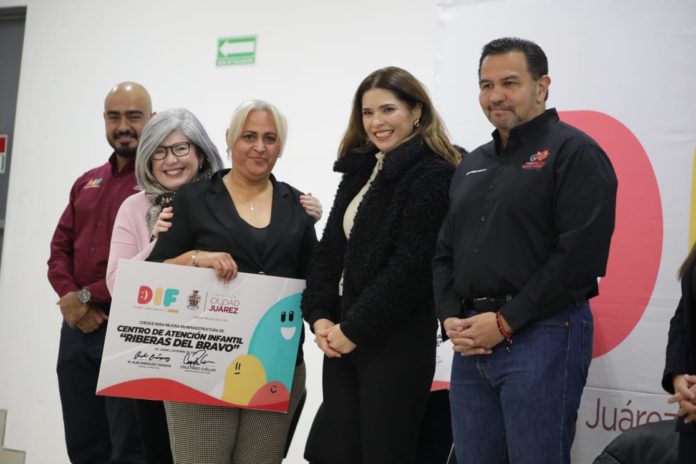 El Presidente Municipal, Cruz Pérez Cuéllar y la Presidenta del DIF Municipal, Rubí Enríquez, dieron hoy los certificados para cuidadoras y la entrega simbólica del recurso que será destinado para mejorar las instalaciones o adquirir equipamiento en estos lugares donde se cuida a niños hijos de padres trabajadores.