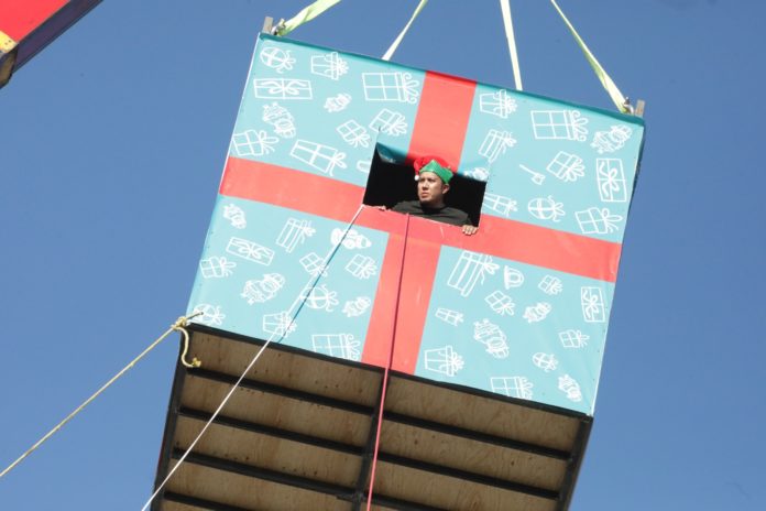 Román Vázquez descendió de una estructura en forma de regalo con el apoyo de una grúa, rodeado del cuidado del personal de Protección Civil y del departamento de Bomberos.