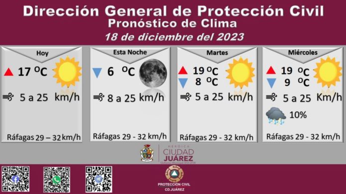 Roberto Briones Mota, titular de la dependencia, informó que para hoy se esperan fuertes ráfagas de viento que alcanzarán los 32 kilómetros por hora, en tanto que la velocidad del viento durante el día oscilará entre 5 y 25 kilómetros por hora.