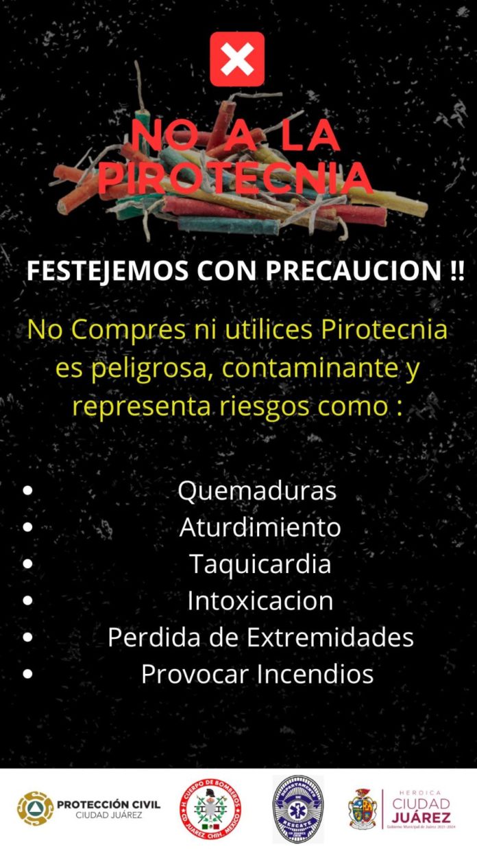 La Dirección General de Protección Civil hace un llamado a la ciudadanía para que durante las festividades de Navidad y Año Nuevo, eviten el uso de juegos pirotécnicos, debido a los riesgos que existen en el manejo de estos artefactos, mencionó Roberto Briones Mota, titular de la dependencia.