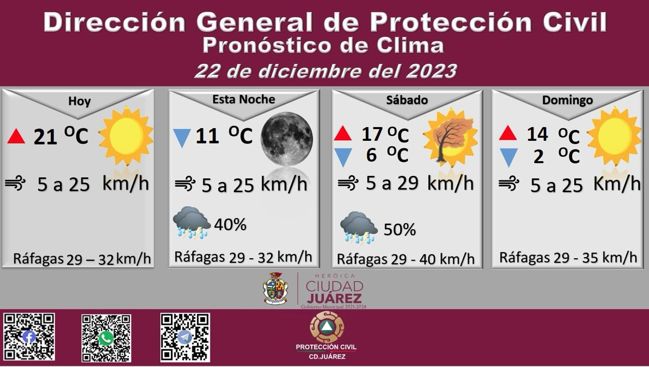 Para hoy se esperan ráfagas de viento que alcanzarán los 32 kilómetros por hora, la temperatura máxima será de 21 °C y la mínima de 11 °C, la velocidad del viento será de 5 a 25 kilómetros por hora.