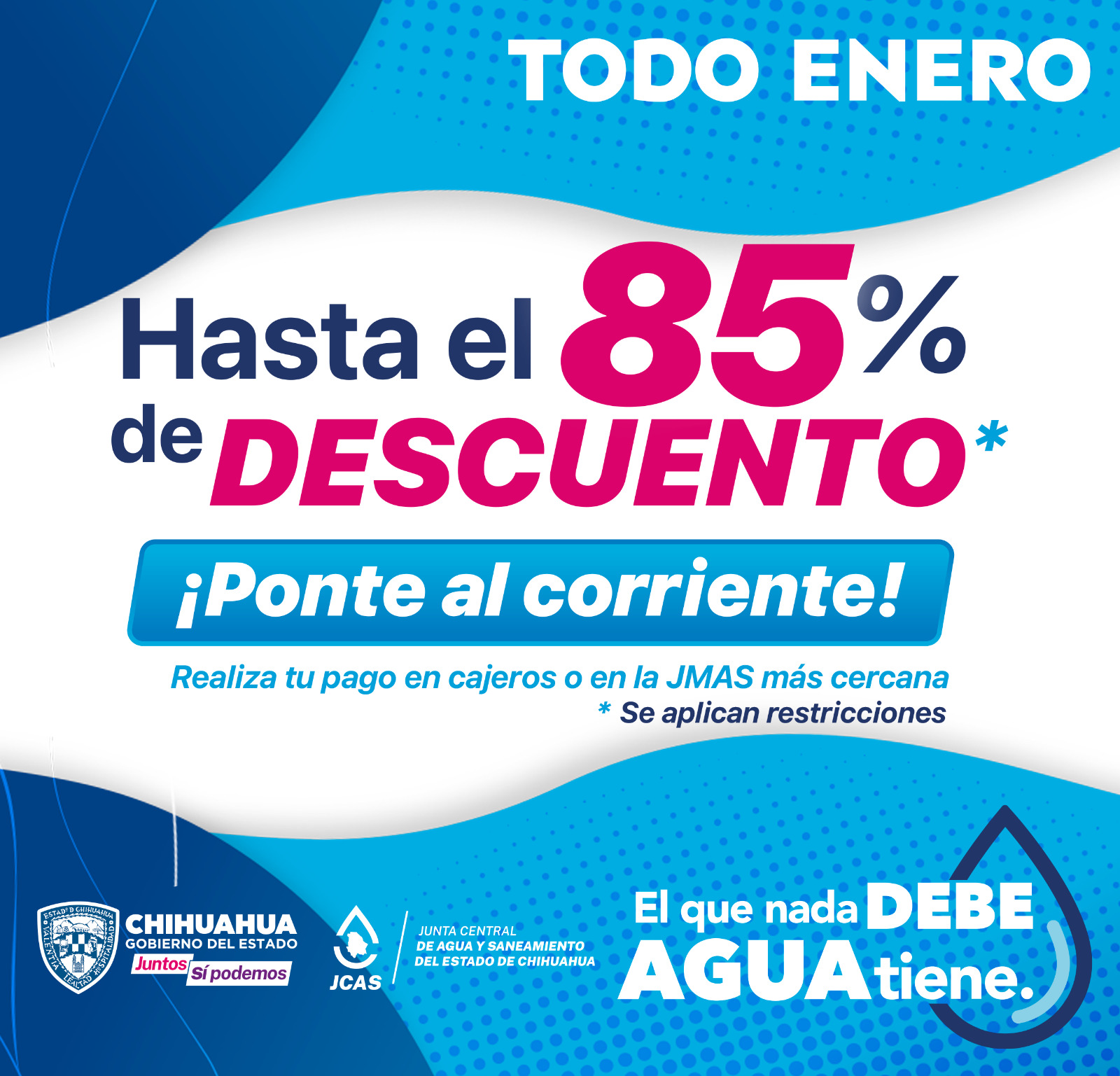 La Junta Central de Agua y Saneamiento (JCAS) anuncia que, el programa “El que Nada Debe, Agua Tiene” continúa ofreciendo sus beneficios con descuentos en adeudos, durante el mes de enero.