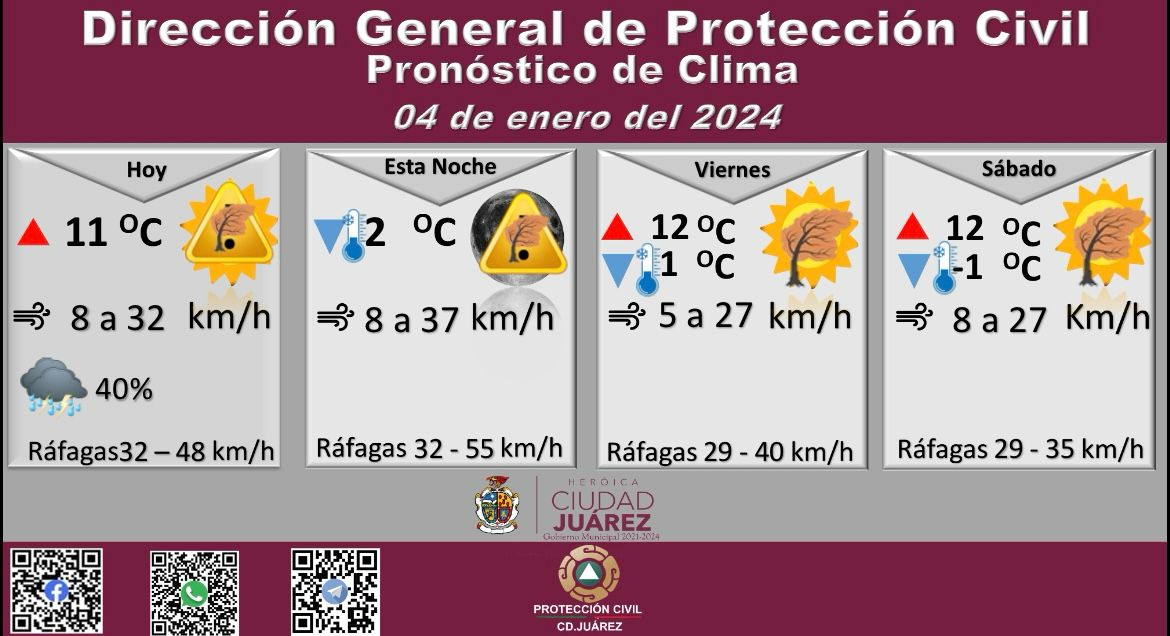 Roberto Briones Mota, titular de la dependencia, mencionó que para este día se espera una temperatura máxima de 11 °C, mientras que la mínima será de 2 °C, la velocidad del viento oscilará de 8 a 37 kilómetros por hora.