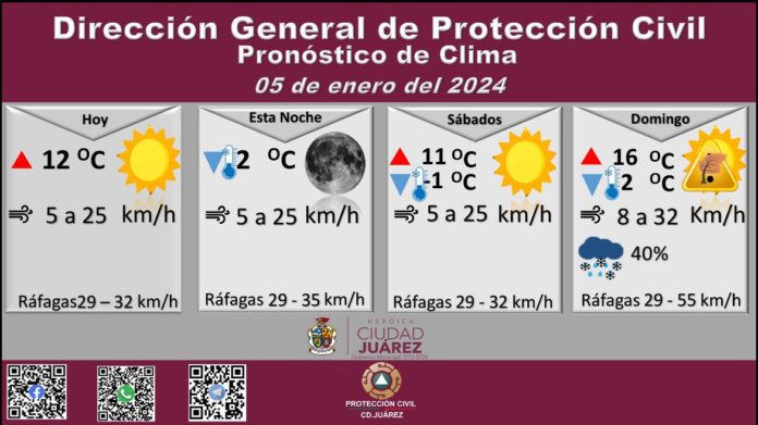 Roberto Briones Mota, titular de la dependencia, informó que para hoy se esperan fuertes ráfagas de viento que alcanzarán los 35 kilómetros por hora, en tanto que la velocidad del viento durante el día oscilará entre 5 y 25 kilómetros por hora.