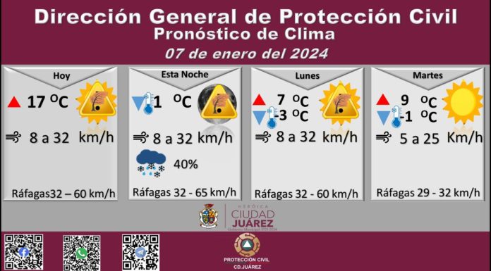 Roberto Briones Mota, titular de la dependencia, informó que para hoy se esperan fuertes ráfagas de viento que alcanzarán los 65 kilómetros por hora, en tanto que la velocidad del viento durante el día oscilará entre 8 y 32 kilómetros por hora.