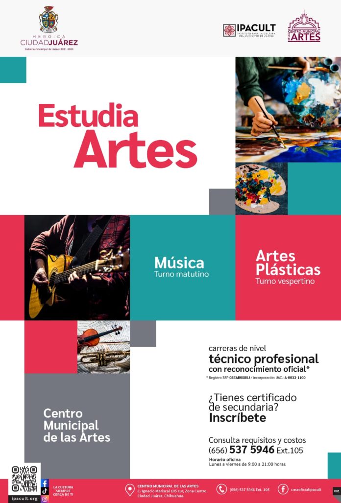 El año inicia y con él los nuevos propósitos para el crecimiento personal. Es por ello que el Instituto para la Cultura del Municipio de Juárez (IPACULT), te presenta a través del Centro Municipal de las Artes, la opción de estudiar en la rama de las artes.