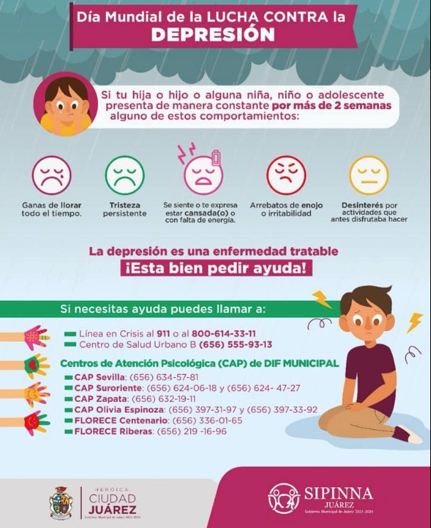 En el marco del Día Mundial de la Lucha contra la Depresión y el “Blue Monday” o día más triste del año, el Sistema Municipal de Protección Integral de Niñas, Niños y Adolescentes (SIPINNA), pide a los padres de familia estar alertas y buscar ayuda en caso de detectar algunos comportamientos extraños en sus hijos.