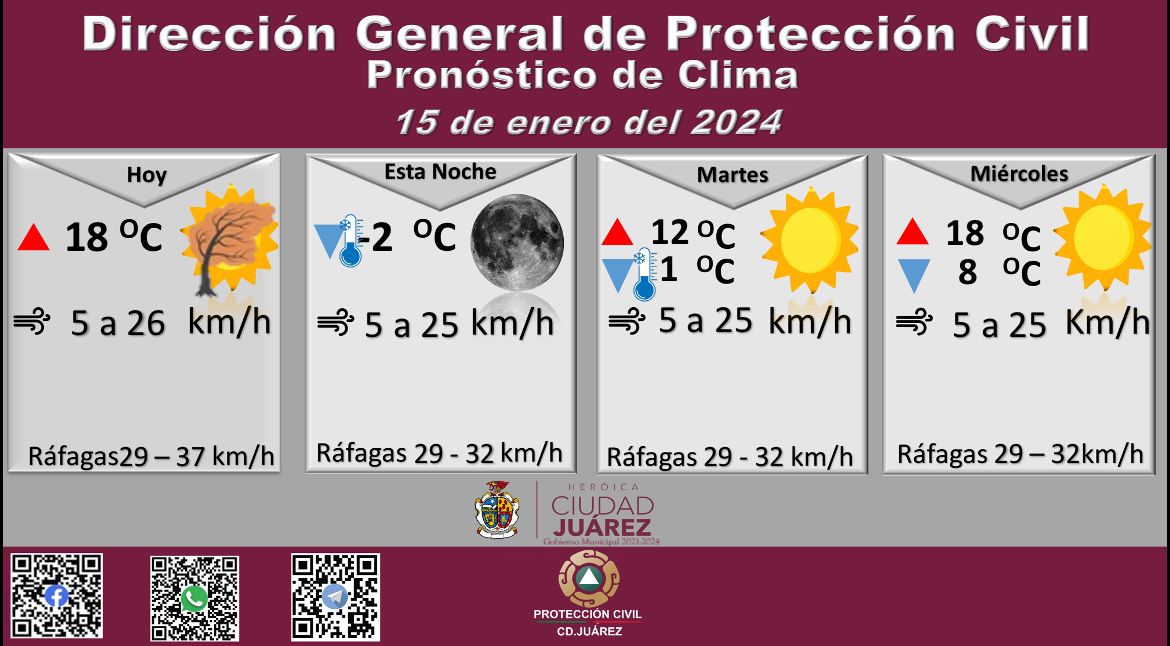 Roberto Briones Mota, titular de la dependencia, informó que para hoy se esperan fuertes ráfagas de viento que alcanzarán los 37 kilómetros por hora, en tanto que la velocidad del viento durante el día oscilará entre 5 y 26 kilómetros por hora.