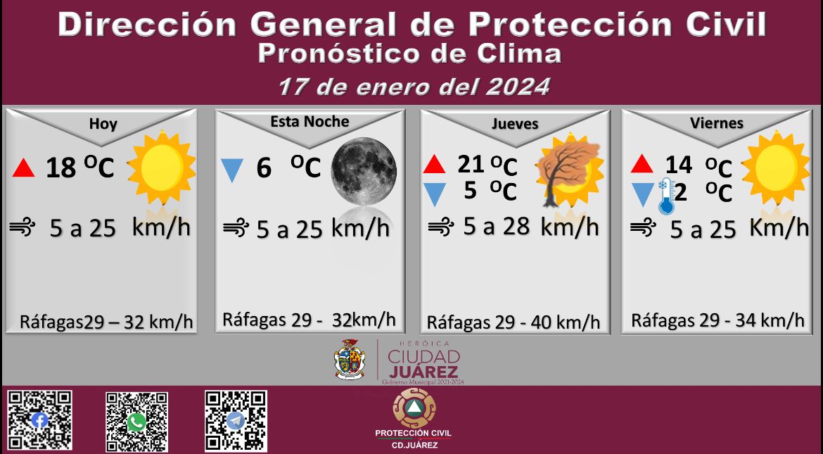 Roberto Briones Mota, titular de la dependencia, informó que para hoy se esperan fuertes ráfagas de viento que alcanzarán los 32 kilómetros por hora, en tanto que la velocidad del viento durante el día oscilará entre 5 y 25 kilómetros por hora.