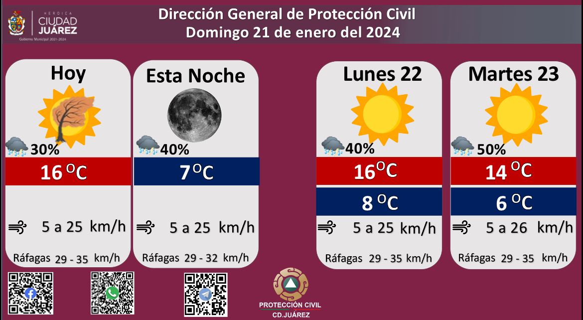 Roberto Briones Mota, titular de la dependencia, informó que para hoy se esperan fuertes ráfagas de viento que alcanzarán los 35 kilómetros por hora, en tanto que la velocidad del viento durante el día oscilará entre 5 y 25 kilómetros por hora.