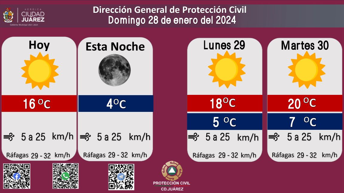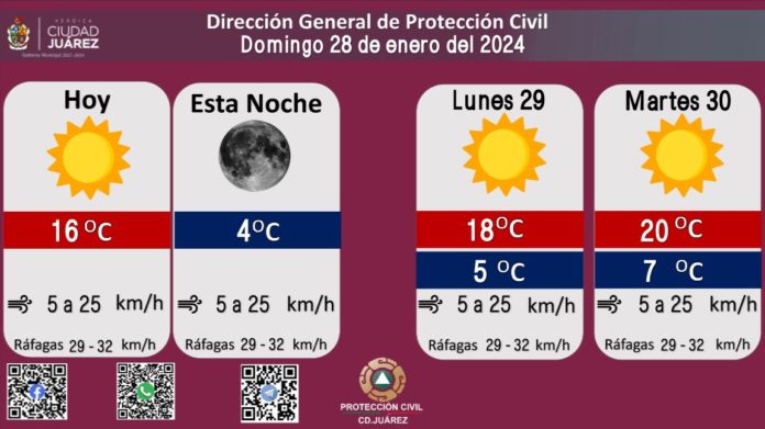 Roberto Briones Mota, titular de la dependencia, informó que para hoy se esperan fuertes ráfagas de viento que alcanzarán los 32 kilómetros por hora, en tanto que la velocidad del viento durante el día oscilará entre 5 y 25 kilómetros por hora.