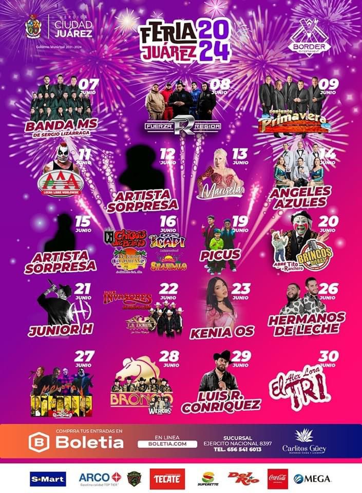 Con la presentación de más de 20 artistas, tres de ellos sorpresa, lucha libre, nuevos juegos mecánicos, circo y otras atracciones, se dio a conocer en la conferencia de prensa semanal del Presidente Municipal, Cruz Pérez Cuéllar, la cartelera de la Feria Juárez 2024, la cual tendrá lugar en la Plaza de la Mexicanidad del 7 al 30 de junio.
