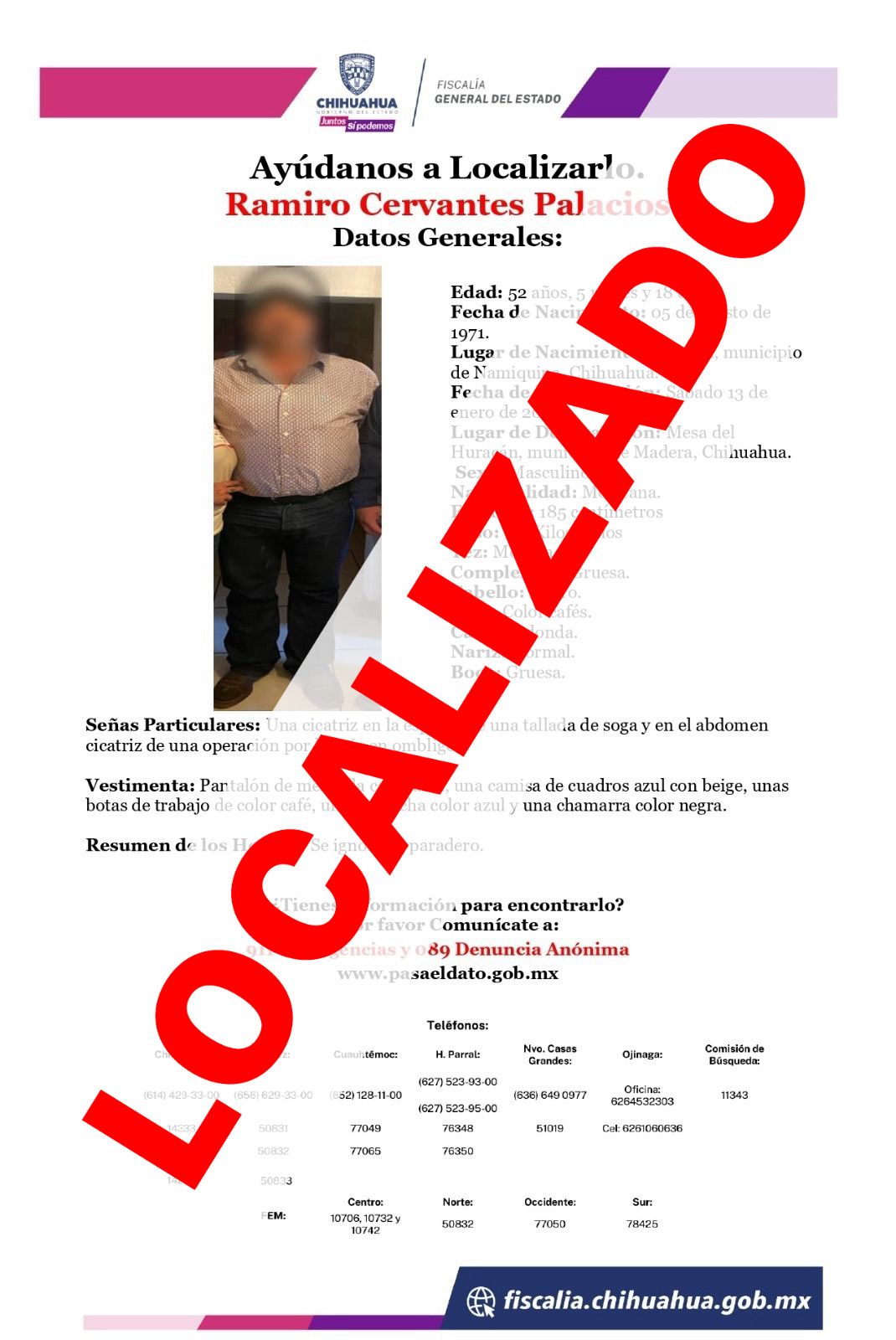 Cuauhtémoc, Chih., a 31 de enero de 2024.- El Fiscal General del Estado, César Jáuregui Moreno, informó esta mañana la localización de la persona de nombre Ramiro C. P., de 52 años de edad, quien contaba con reporte de desaparición con fecha del 17 de enero del presente año.