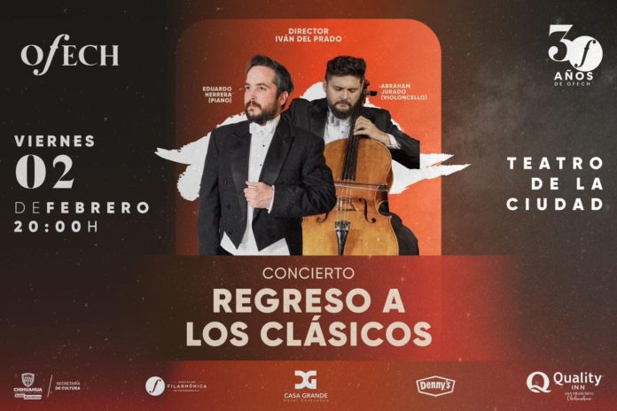 Como parte de las actividades que se desarrollan en el marco del 30 Aniversario de la Orquesta Filarmónica del Estado de Chihuahua (OFECh), la Secretaría de Cultura invita al concierto “Regreso a los Clásicos”, que se realizará el viernes 2 de febrero a las 20:00 horas, en el Teatro de la Ciudad.