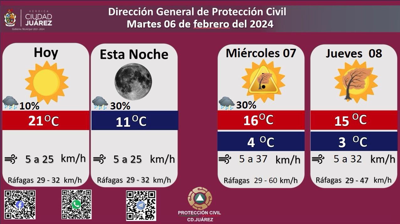 Para mañana miércoles se esperan fuertes ráfagas de viento que llegarán a los 60 kilómetros por hora, continuará la probabilidad de lluvia de un 30 por ciento, la temperatura máxima se pronostica en los 16 °C, mientras que la mínima será de 4 °C, la velocidad del viento oscilará de 5 a 37 kilómetros por hora.