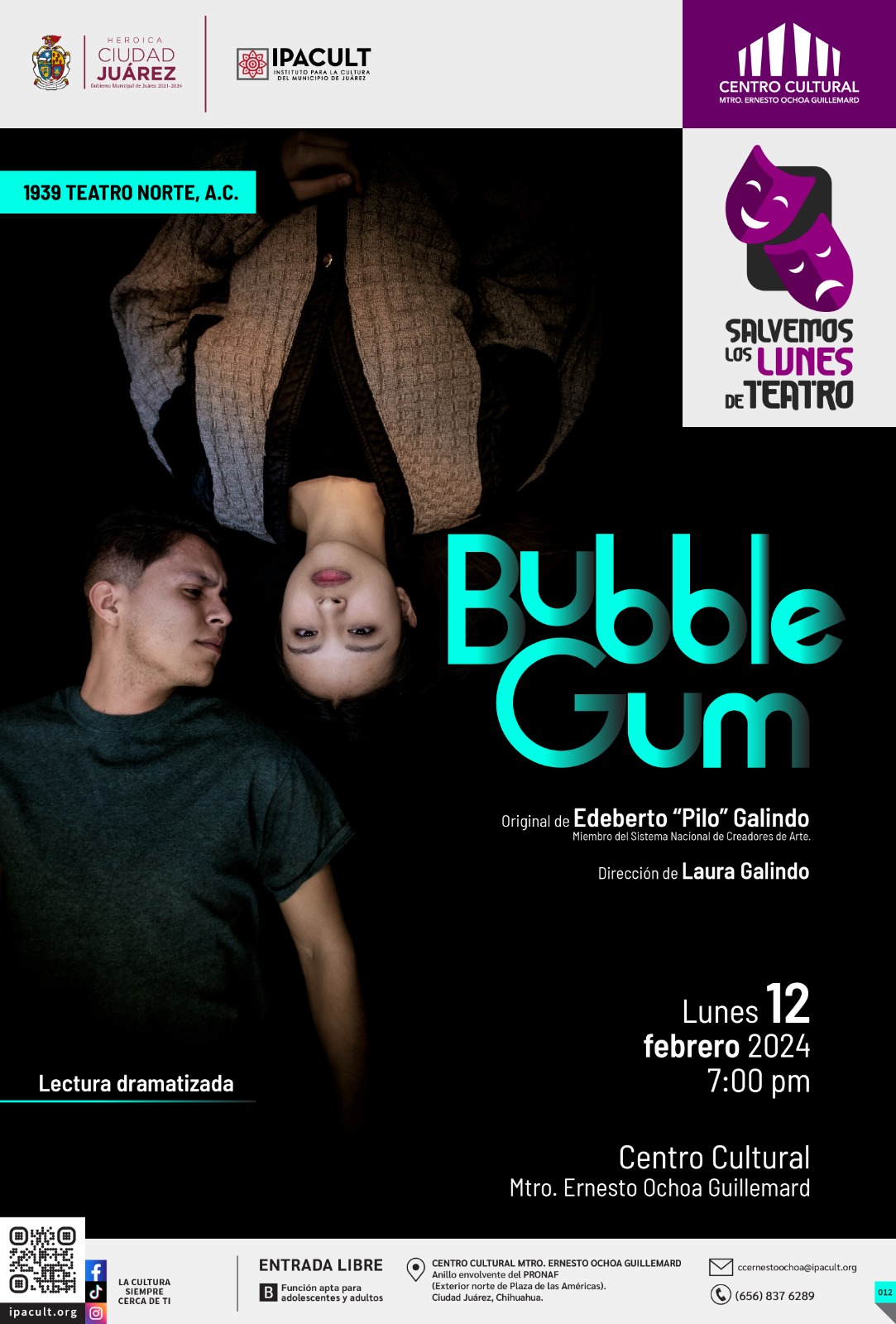 La lectura dramatizada para el próximo lunes 12 de febrero es “Bubble Gum”, que se estará presentando a las 7:00pm en el Centro Cultural Ernesto Ochoa Guillemard, situado en la avenida Lincoln en el anillo envolvente del Pronaf del condominio La Plata.