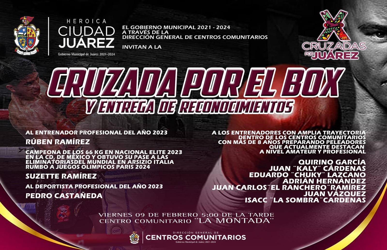 La Dirección General de Centros Comunitarios invita a la población en general a disfrutar la Cruzada por el Box que se llevará a cabo mañana en el Centro Comunitario La Montada.