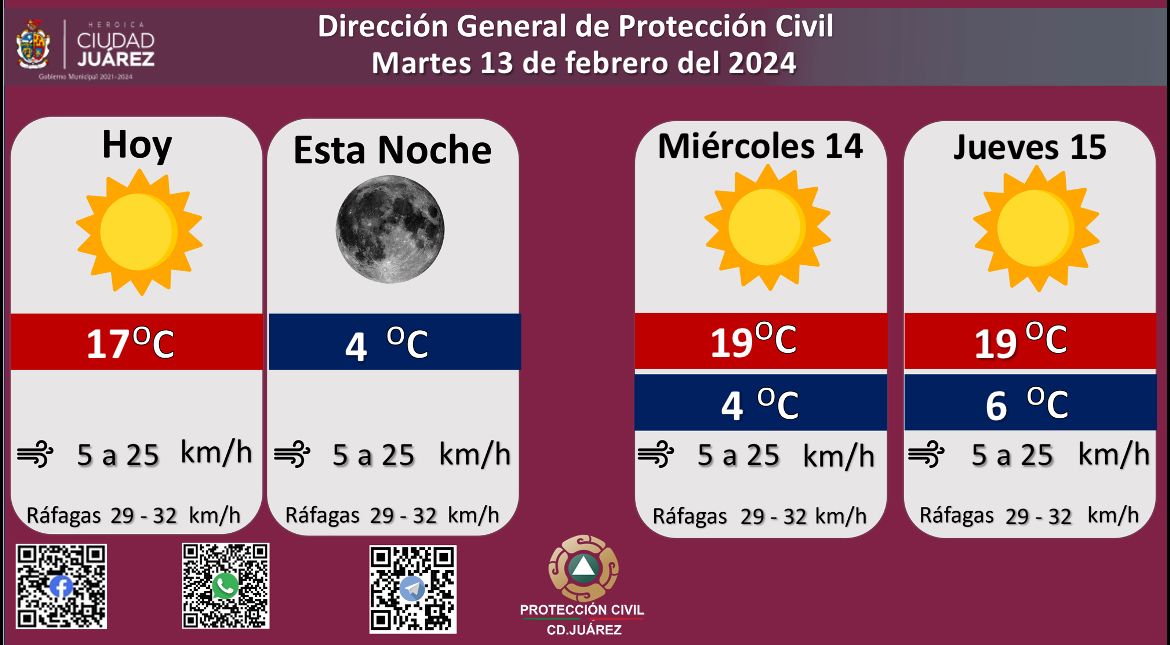 Roberto Briones Mota, titular de la dependencia, informó que para hoy se esperan ráfagas de viento que alcanzarán los 32 kilómetros por hora, en tanto que la velocidad del viento durante el día oscilará entre 5 y 25 kilómetros por hora.