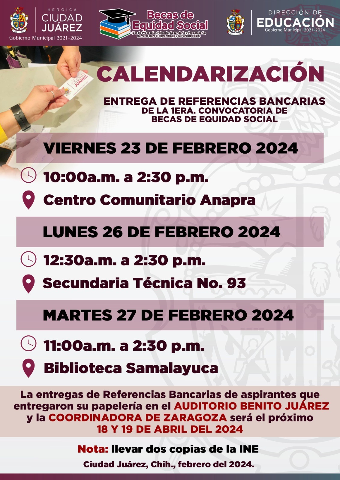 El 23 de febrero se hará entrega de becas en el Centro Comunitario Anapra, en horario de 10:00 de la mañana a 2:30 de la tarde. El 27 de febrero serán las entregas en la biblioteca de Samalayuca, a partir de las 11:00 y hasta las 14:30 horas, mientras que el 28 de febrero serán en la Secundaria Técnica 93, de 10:00 de la mañana a 2:30 de la tarde.