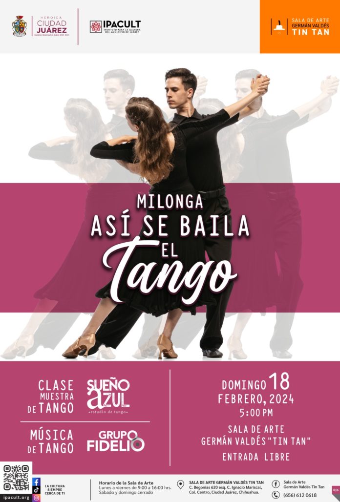 Como parte de las actividades que lleva a cabo la Sala de Arte Germán Valdés “Tin Tan”, se presenta este domingo 18 de febrero a las 5:00 de la tarde, el programa: Milonga, así se baila tango. En donde, además, tendrán música en vivo.