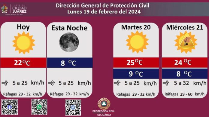 El miércoles se esperan ráfagas de viento de 60 kilómetros por hora, la temperatura máxima será de 24 °C y mínima de 8 °C, en tanto que la velocidad del viento será de 5 a 32 kilómetros por hora.