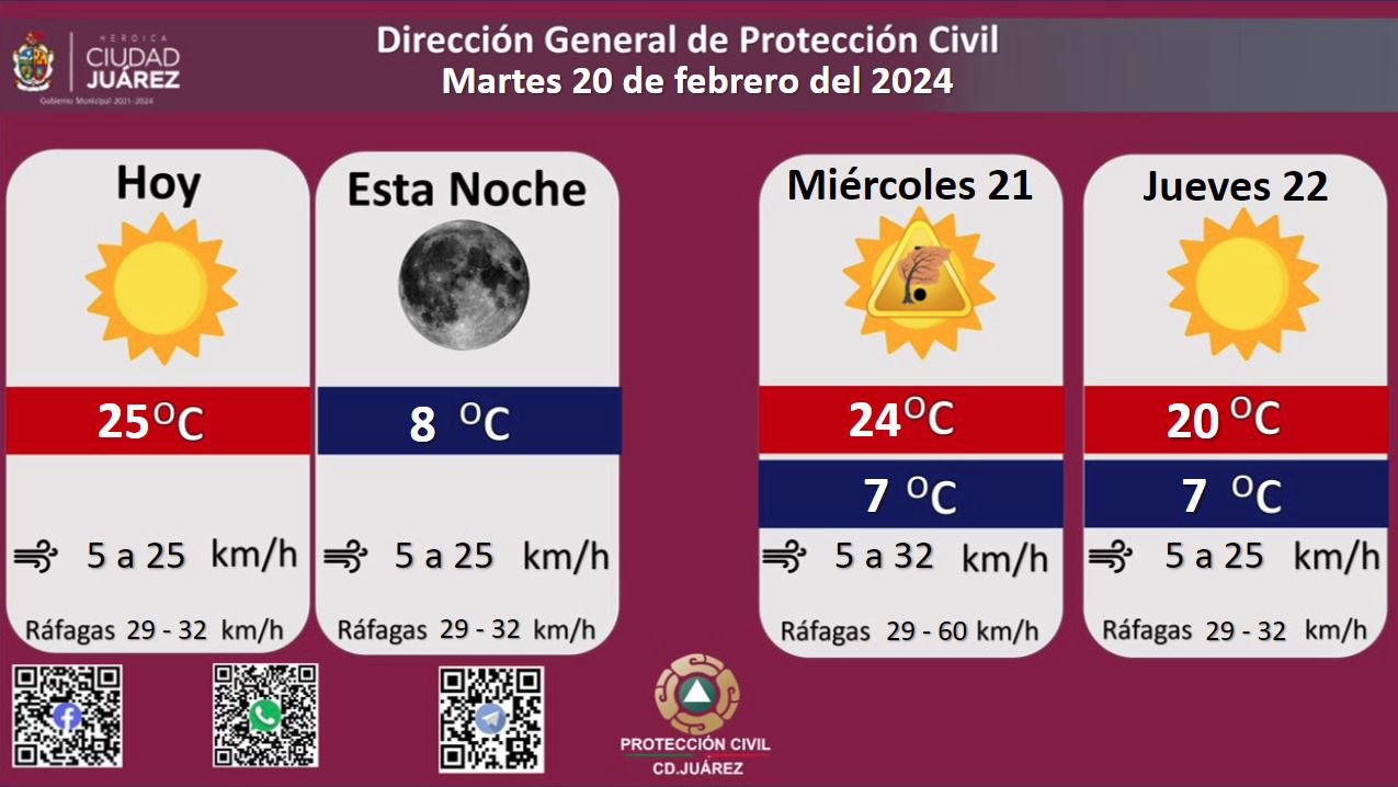 Para mañana miércoles se esperan fuertes ráfagas de viento que alcanzarán los 60 kilómetros por hora, la temperatura máxima se pronostica en los 24 °C, mientras que la mínima será de 7 °C, la velocidad del viento oscilará de 5 a 32 kilómetros por hora.