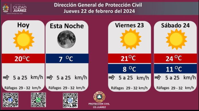 Roberto Briones Mota, titular de la dependencia, dijo que hoy se esperan fuertes ráfagas de viento que alcanzarán los 32 kilómetros por hora, en tanto que la velocidad del viento durante el día oscilará entre 5 y 25 kilómetros por hora.