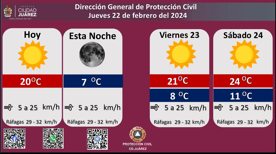 Para mañana viernes se esperan fuertes ráfagas de viento que alcanzarán los 32 kilómetros por hora, la temperatura máxima se pronostica en los 21 °C, mientras que la mínima será de 8 °C, la velocidad del viento oscilará de 5 a 25 kilómetros por hora.