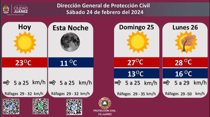 Roberto Briones Mota, titular de la dependencia, informó que para hoy se esperan fuertes ráfagas de viento que alcanzarán los 32 kilómetros por hora, en tanto que la velocidad del viento durante el día oscilará entre 5 y 25 kilómetros por hora.