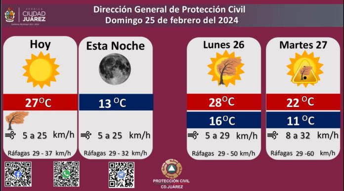Roberto Briones Mota, titular de la dependencia, informó que para hoy se esperan fuertes ráfagas de viento que alcanzarán los 32 kilómetros por hora, en tanto que la velocidad del viento durante el día oscilará entre 5 y 25 kilómetros por hora.