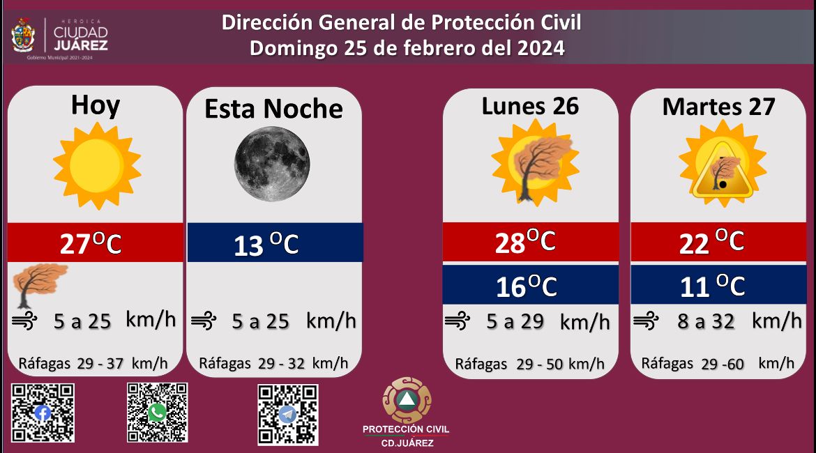 Para mañana lunes se esperan fuertes ráfagas de viento que llegarán los 50 kilómetros por hora, la temperatura máxima se pronostica en los 28 °C, mientras que la mínima será de 16 °C, la velocidad del viento oscilará de 5 a 29 kilómetros por hora.
