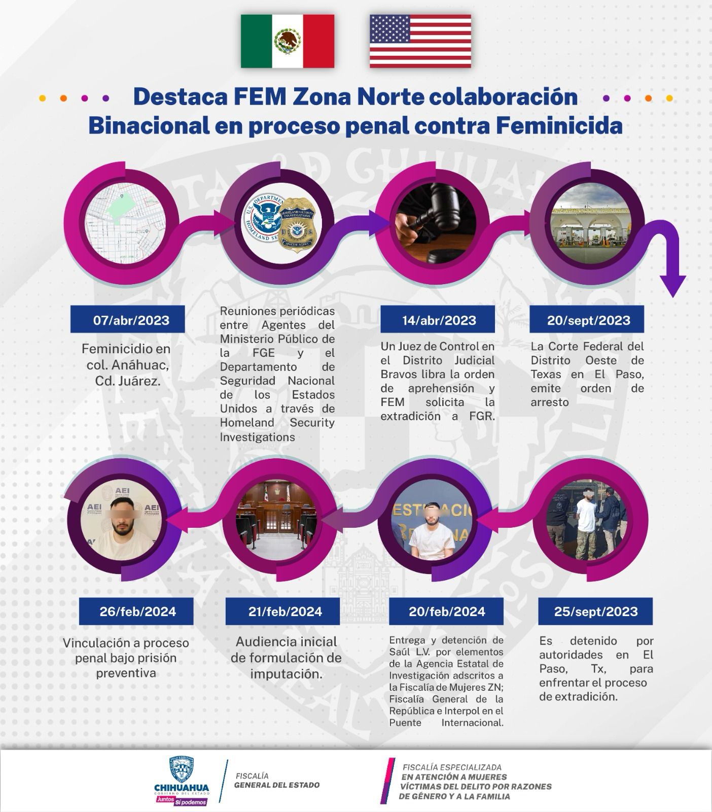 La cooperación y coordinación binacional entre el Departamento de Seguridad Nacional de los Estados Unidos, a través de la Homeland Security Investigations y demás autoridades estadounidenses, permitió a la Unidad de Feminicidios en Ciudad Juárez, obtener la información de las fechas en que el imputado cruzó de El Paso, Texas hacia Ciudad Juárez.