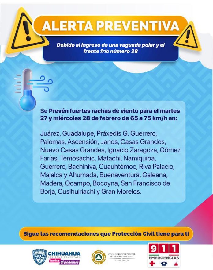 Para esta tarde de lunes 26 de febrero, se esperan rachas de viento que pueden superar los 65 y 75 km/h en Ascensión, Janos, Casas Grandes, Nuevo Casas Grandes, Ignacio Zaragoza, Gómez Farías y Madera, y superar los 55 km/h en Juárez, Guadalupe, Práxedis G. Guerrero, Buenaventura, Namiquipa, Temósachic, Carichí, Cusihuiriachi, Cuauhtémoc, Chihuahua, Satevó, Rosales, Saucillo, San Francisco de Conchos, Camargo, Parral y Allende.