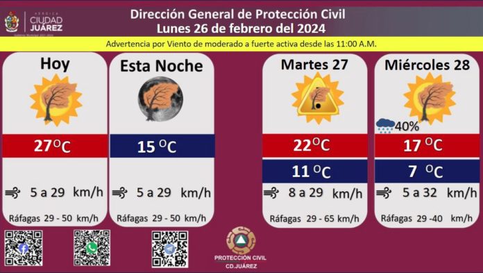 Roberto Briones Mota, titular de la dependencia, informó que para hoy se esperan fuertes ráfagas de viento que alcanzarán los 50 kilómetros por hora, en tanto que la velocidad del viento durante el día oscilará entre 5 a 29 kilómetros por hora.