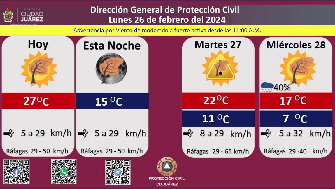 Para mañana martes se esperan fuertes ráfagas de viento que llegarán a los 65 kilómetros por hora, la temperatura máxima se pronostica en los 22 °C, mientras que la mínima será de 11 °C, la velocidad del viento oscilará de 8 a 29 kilómetros por hora.