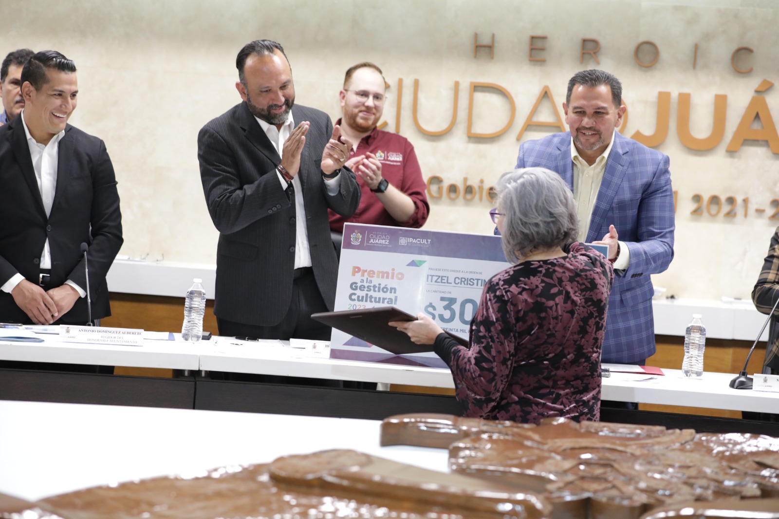 El Presidente Municipal, Cruz Pérez Cuéllar, entregó el Premio al Gestor Cultural a la artista Itzel Cristina Aguilera González, por su destacada trayectoria y por promover la cultura.